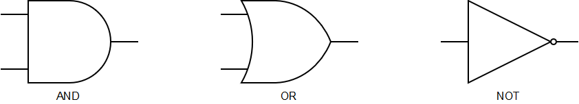 Not: A not gate takes only one input and makes one output. With this gate the opposite of the input is the output. For example true would turn into false and false would turn into true. This gate is represented by a Triangle with a circle on the tip.